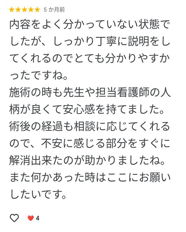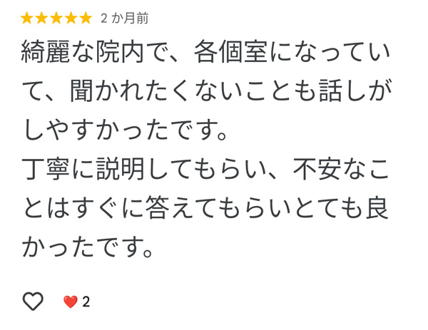 院内の清潔感やスタッフの説明態度についても評価されており、初めての方でも落ち着いて相談できそうな印象を受けますね。