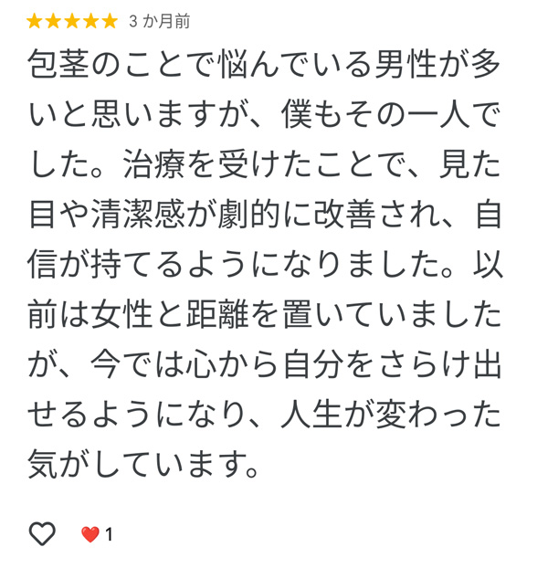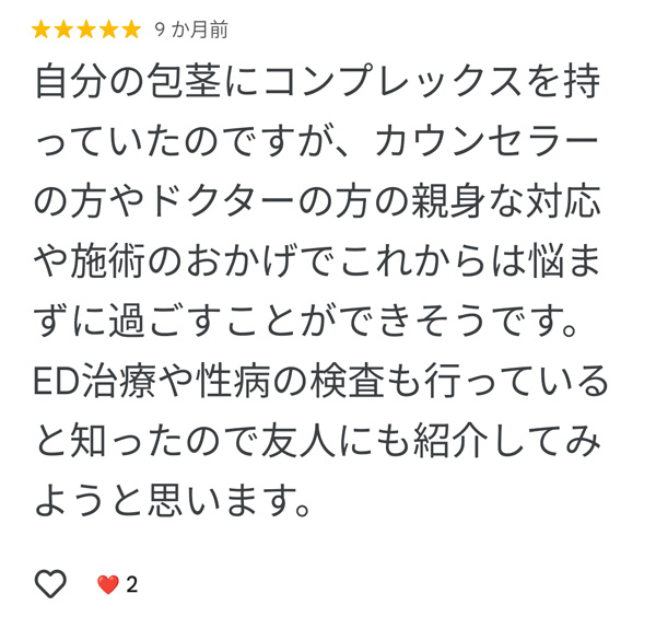 包茎治療だけでなく、ED治療や性病検査など、男性特有の悩みをトータルでケアできる「男性総合医療」としての利便性も評価されているようです。